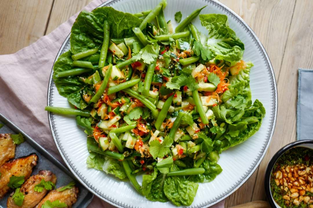 - Salat: Skrell og riv gulrot. Kok aspargesbønner møre og skyll dem i iskaldt vann. Brekk opp salatblader og dander på fat med gulrot, bønner, paprika, agurk, chili, koriander og et dryss sesamfrø.