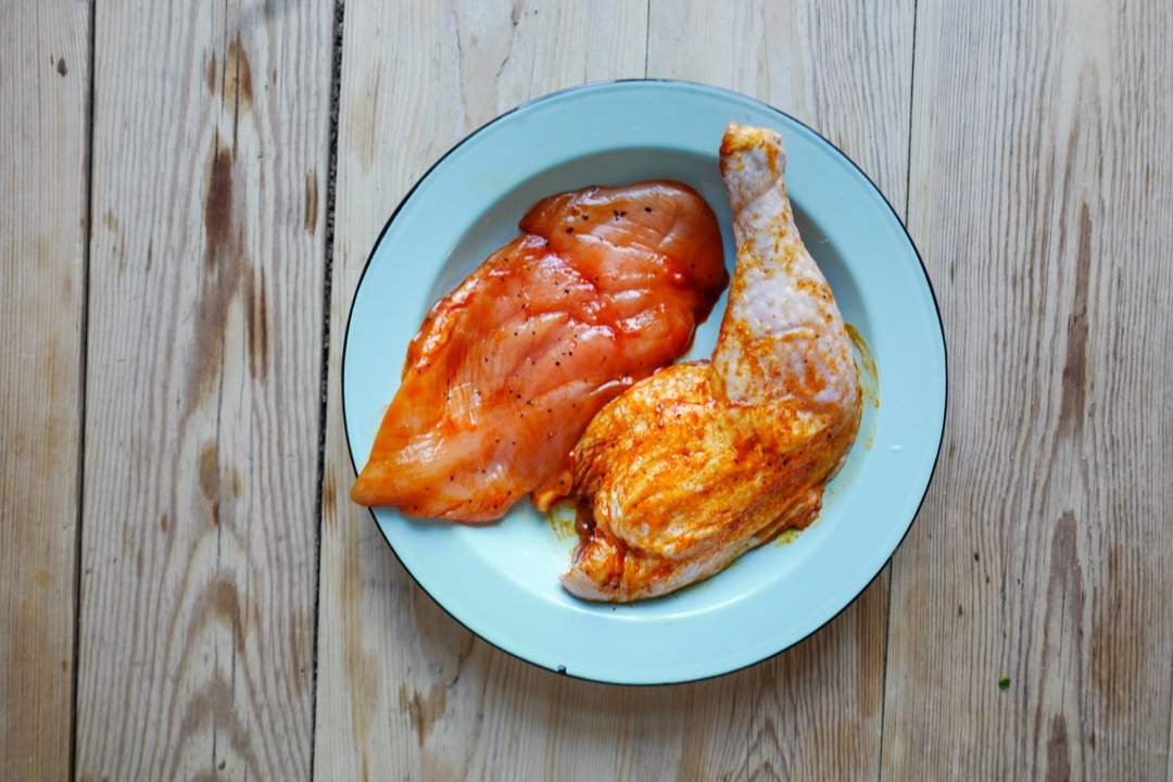 Paprika- og hvitløksmarinert kyllinglår fra Lerstang er også grillklart. Jeg griller dette på indirekte varme til kjernetemperatueren er ca 66 grader i kjøttet. (Ikke mål temperaturen inne ved beinet). Skinnet blir perfekt sprøtt og kjøttet er lett å skjære fra hverandre. Et slikt lår er perfekt mengde kjøtt for en person. Har du ikke steketermometer stikker du en kniv inn mot beinet og ser på fargen på saften som pipler ut. Er den rødlig er kyllingen ikke ferdig. Er saften klar, er kyllingen ferdiggrillet.