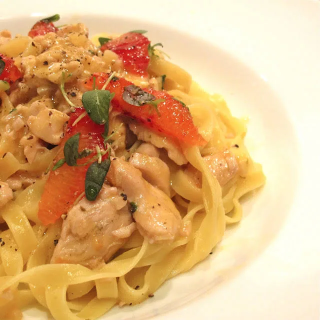 Så derfor har jeg lyst til å gi dere oppskriften på en tallerken pasta med kyllingbryst og blodappelsin. Take it or leave it!