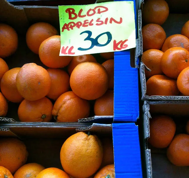 | Hurra! Det finnes fremdeles butikker som skilter med blodappelsiner! Her fra den fremragende grønnsaksbutikken Gulden på Frogner. |