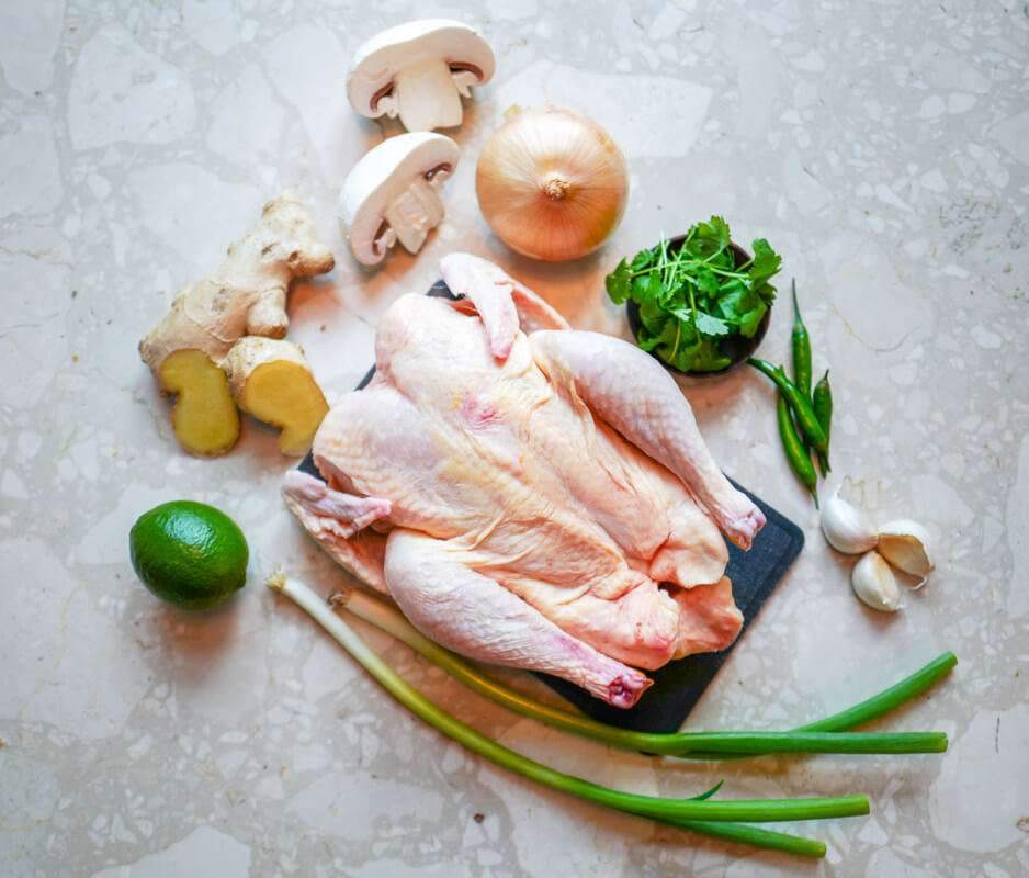 - Før servering varmer du skiver av sopp og små brokkolibuketter i suppen. I hver skål legger du tynne staver av ingefær, grønn chili og vårløkskiver. Legg også litt av det deilige kyllingkjøttet i skålen før du heller herlig, varm og mettende kraft over. Pynt med frisk koriander.