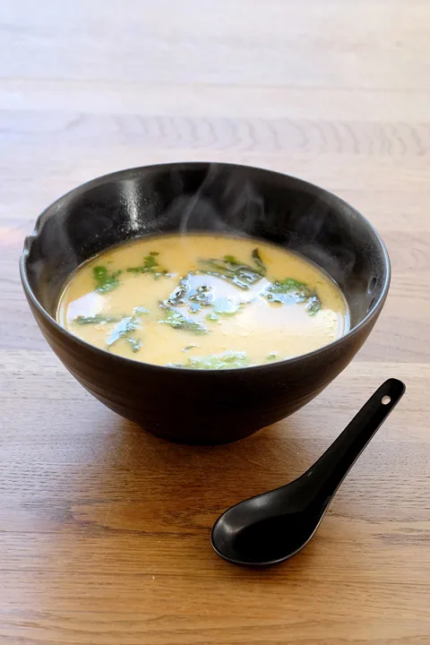 Gi dette et oppkok og juster smaken med limesaft og litt fiskesaus. Jeg tilsetter hakket chili, litt mer revet ingefær, thaibasilikum og koriander til slutt, samt kyllingkjøttet. Noen dråper sesamolje over smaker også kjempegodt.