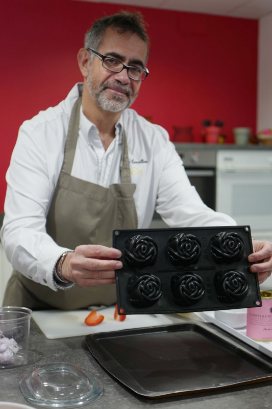 Vi sprøyter kakedeig i roseformede silikonformer. Selvsagt skal kakene ha form som en rose. Oppskriften på desserten finner du nederst i saken.