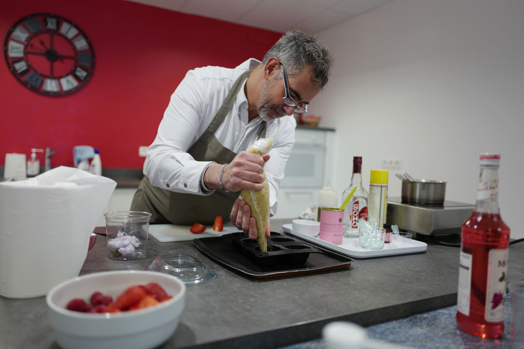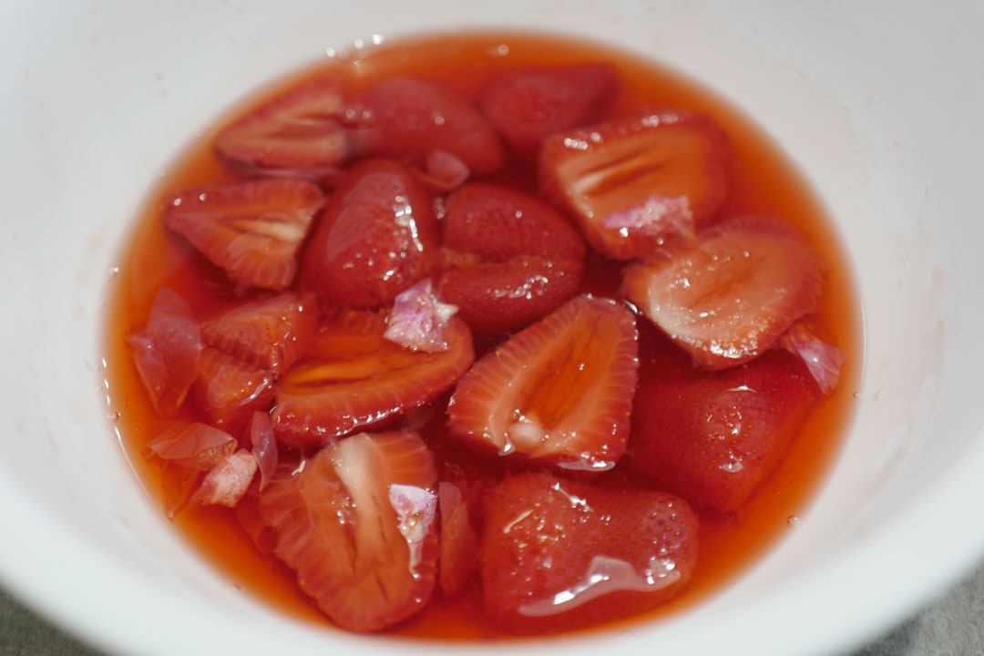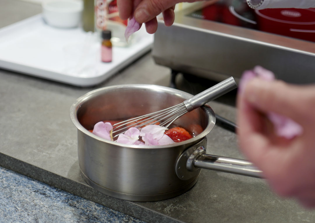 Han koker opp sukker, rosegelé og vann. Når dette har kokt opp tar han gryten fra platen og tilsetter roseblader og delte jordbær. Dette skal nå kjøles ned og tilslutt kjøres med stavmikseren.
