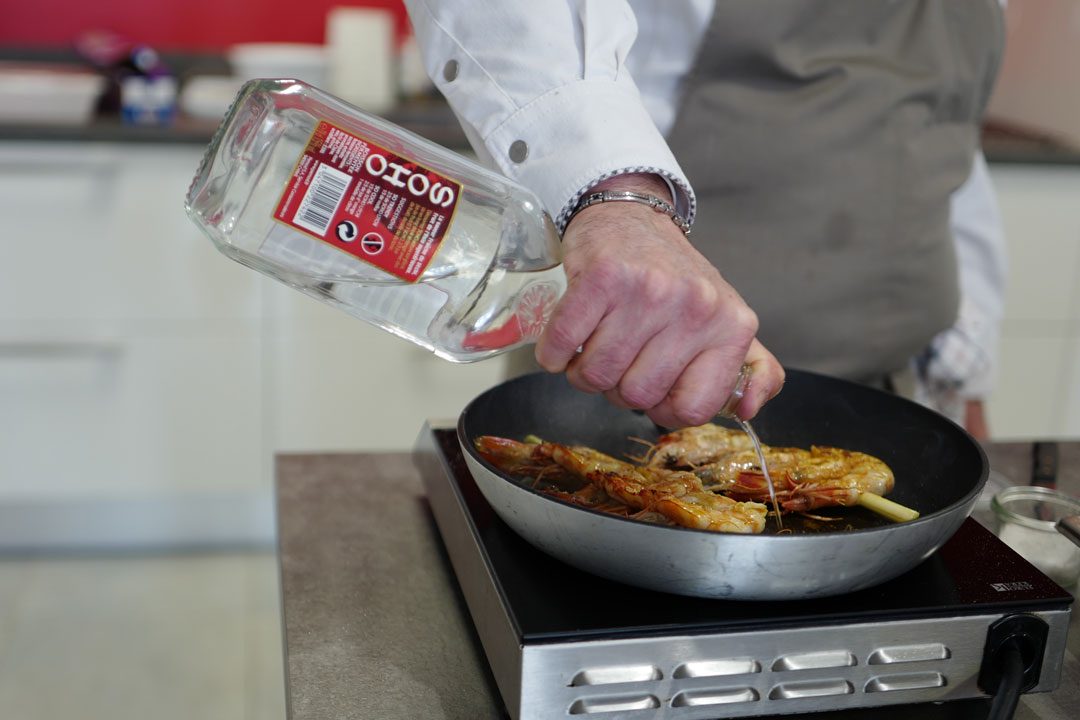 Rekene renses slik at hodet fremdeles sitter på. Tre kjempereker tres på et sitrongress og de stekes i olivenolje i to minutter før de saltes og pepres og snus. Så stekes de nye to minutter. Yves heller litt lichi-likør over (her kan man bruke litt saft fra hermetiserte lichi tilsatt litt vodka). Alkoholen fordamper i pannen og gir en nydelig kraft og smak. Til slutt tilsetter han 7 dråper (per rekespyd). Han tar rekene av pannen og heller kraften over. Disse skal varmes kjapt i ovnen rett før servering.