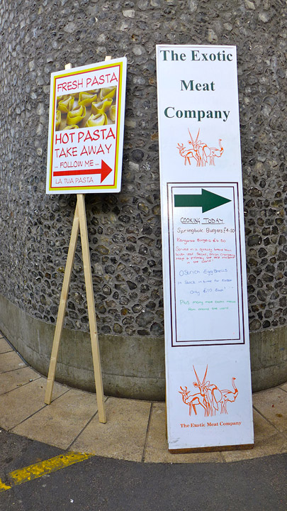 Blekksprut, jo!Eksotisk kjøtt. Følg skiltet.Sunne juicer…og har man sunne juser, har man også hvetegress for den som liker det.Hva med en krokodilleburger?For den som vil smake noe nytt: sebraburger, lamaburger, kamelburger?Nyskåret skinke er vel noe av det beste som finnes i verden.