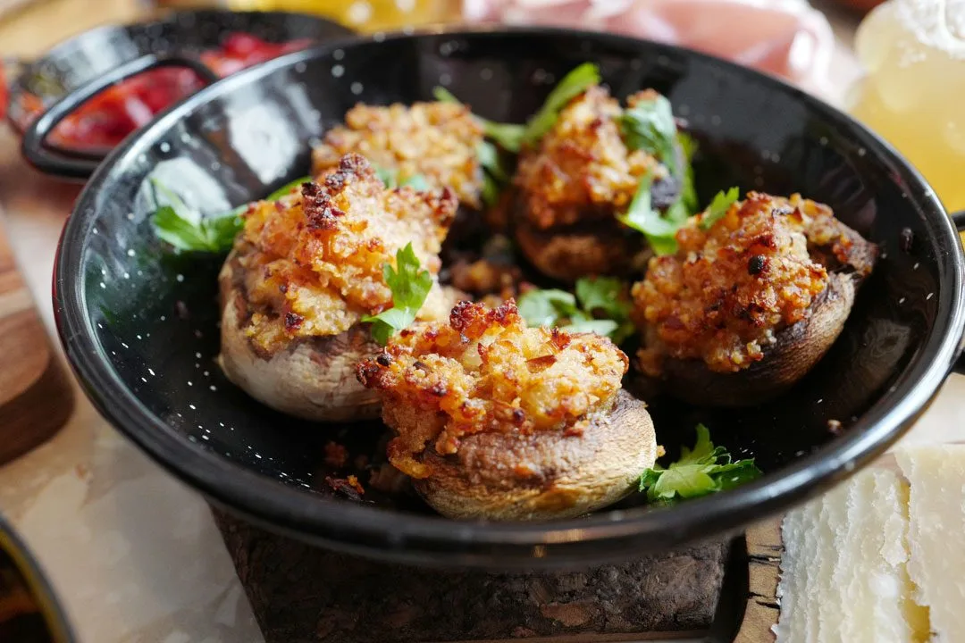Sopp får du i forskjellige varianter på tapasbarer i Spania. Disse er min egen komposisjon og de smaker helt fantastisk om jeg må si det selv. Fyllet er spansk spekeskinke, sterk ost, løk, hvitløk og brødsmuler. Denne retten er fabelaktig å lage når du skal bruke opp noen skalker med spekeskinke og ostebiter.