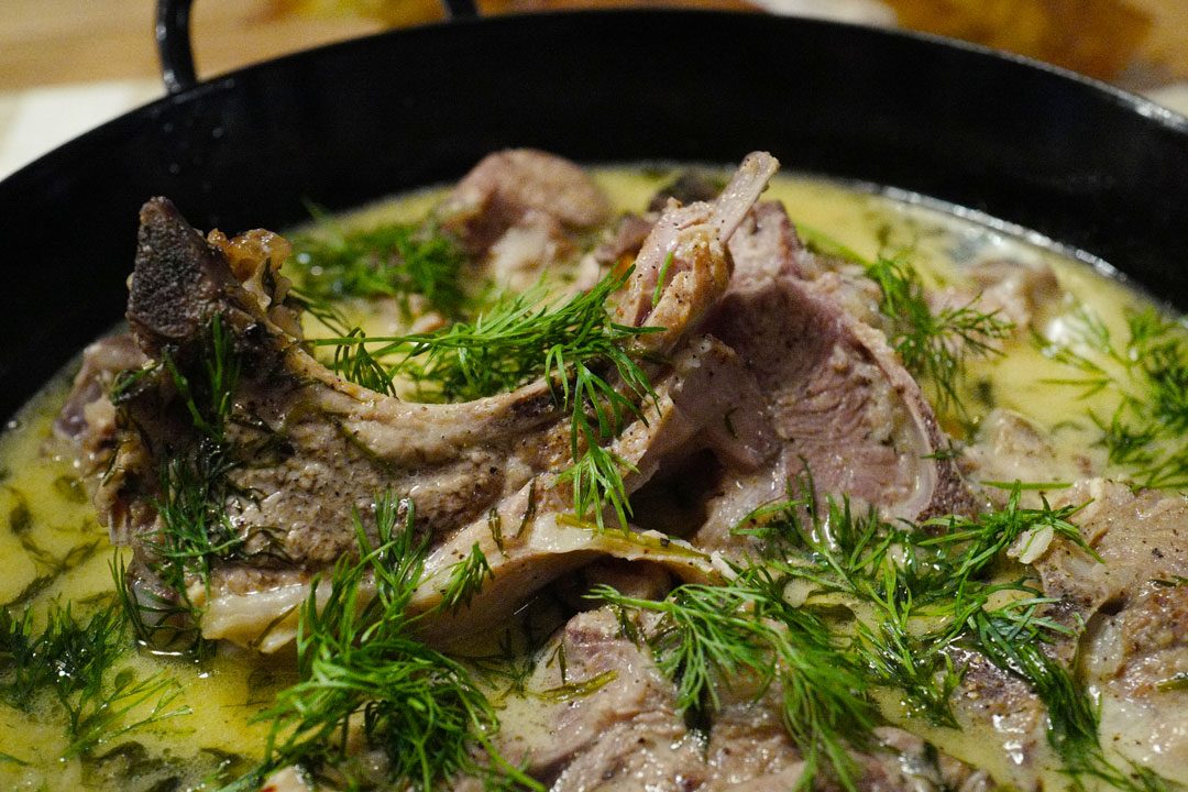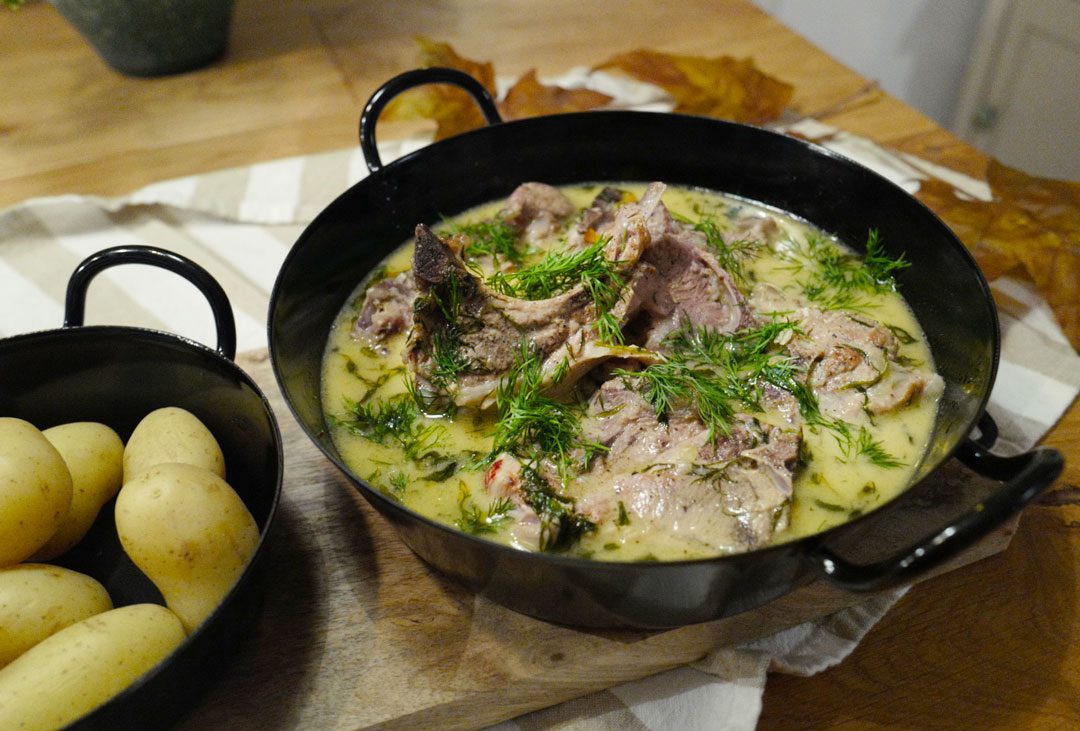 Når gryten er ferdig og kjøttet nesten faller fra beina kan du tilsette mer dill. Server med kokte poteter.