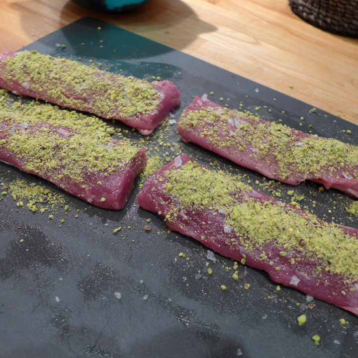 Ytrefilet av lam tørkes og saltes og pepres lett. Så ruller du filetene i pistasjnøtter som er finhakket (eller kjørt fint i blender).