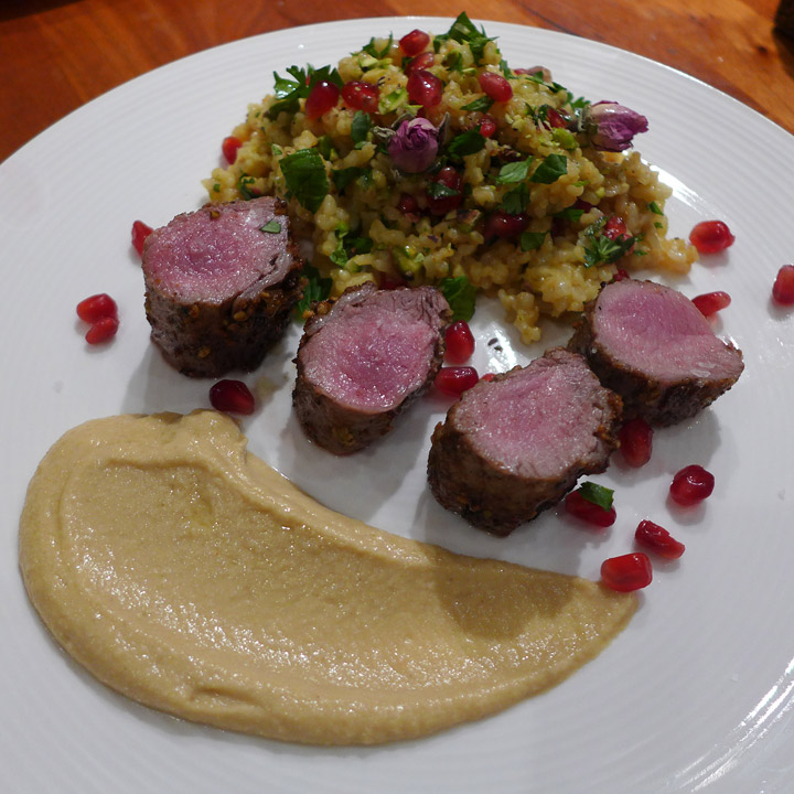Men over til denne oppskriften. Pistasjnøtter, granatepler, hummus, bulgur? Midtøsten? Oh yes! Du har så rett, så rett. Lam + Midtøsten passer sammen som hånd i hanske. Lammekjøttet er selvsagt kjøpt på Bondens marked hos Haugen gardsmat (en av mine favorittprodusenter).