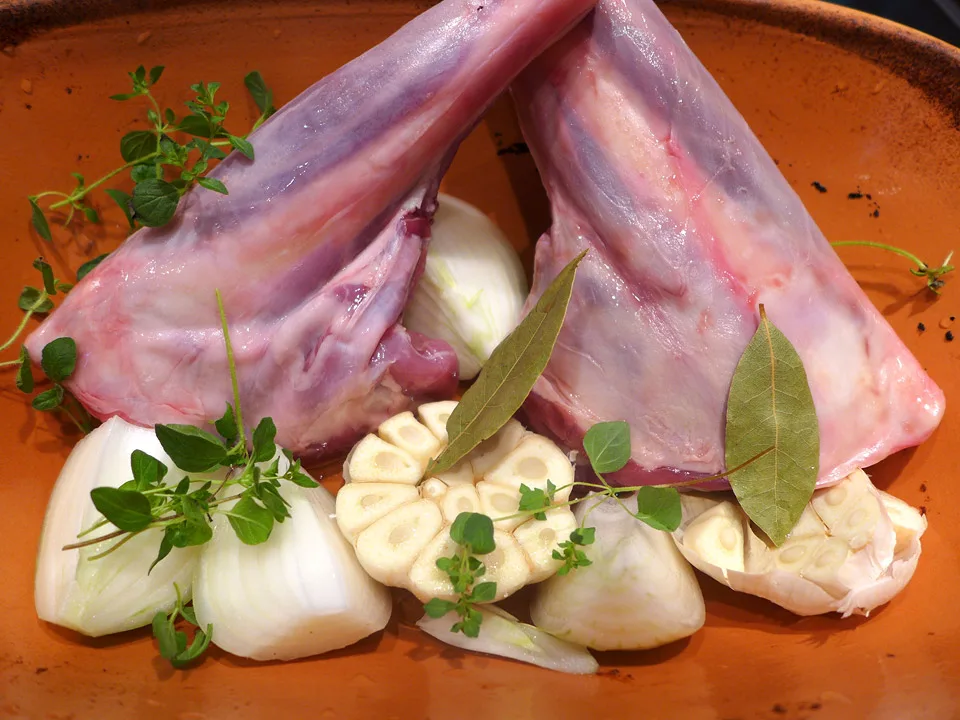 2 lammeskanker (dette er mer enn nok til to personer) legges i en leirgryte. Del en hvitløk i to og legg i bunnen sammen en løk som du har skåret i båter. Tilsett et par laurbærblader og noen kvister frisk oregano.