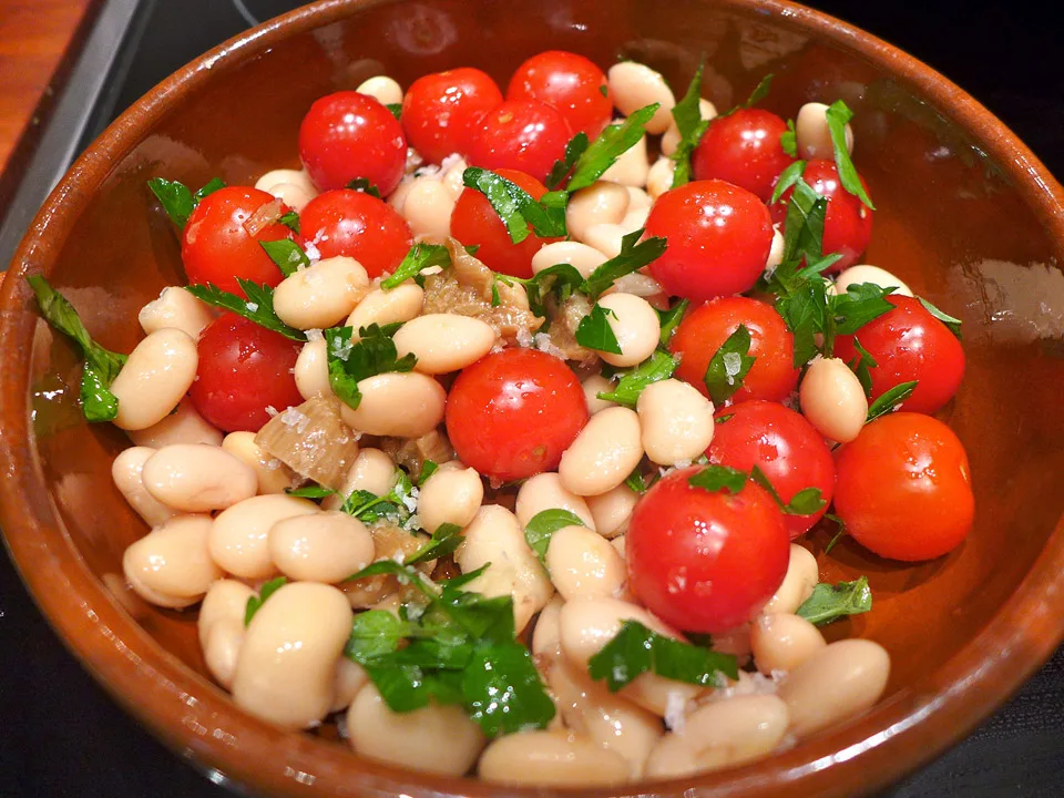 Hvitløken skviser du ut av skallet og over i en ildfast form. 1 boks hvite bønner vaskes. Legg disse i den ildfaste formen sammen masse cherrytomater. Salt og pepre og hell over god olivenolje. Dryss masse persille og oregano over. Sett i ovnen på 200 grader i 20 minutter. Tilbehøret er ferdig.