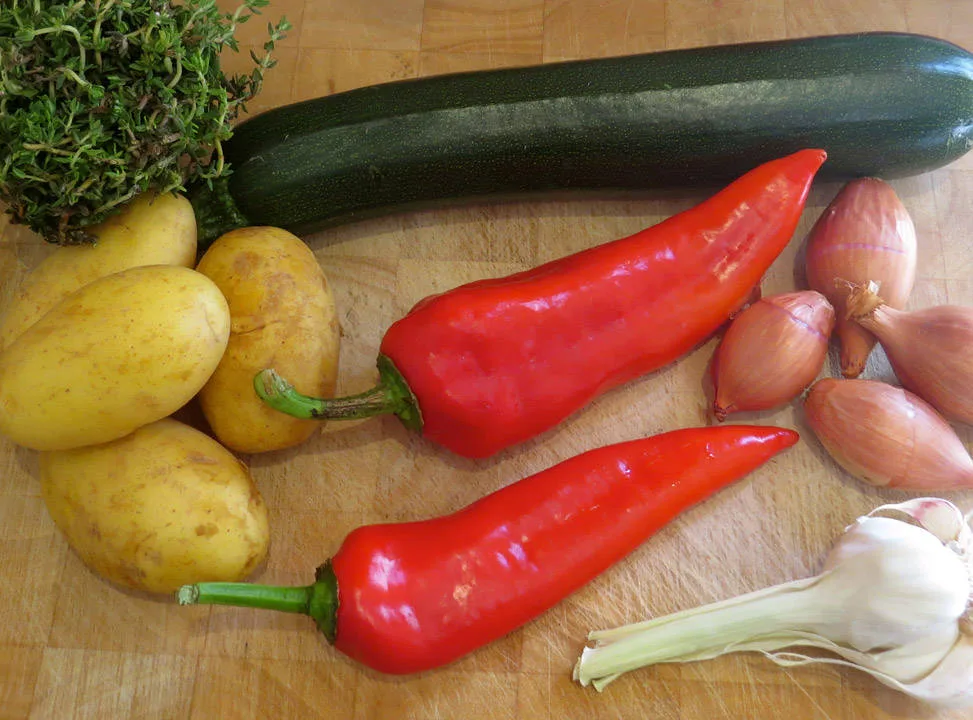 Ha 4-5 ss nøytral olje i gryten. Skjær opp potetbåter, squash i båter, paprika, sjalottløk (de kan være hele, men uten skall), en halv hvitløk, noen grener timian og et par laurbærblader.