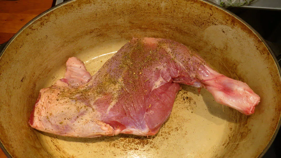 Legg det i en stor gryte med lokk. Du må kanskje bende litt på beinet for å gå plass. Evt kan du bruke en stor stekeform som du dekker med folie (helt tett).