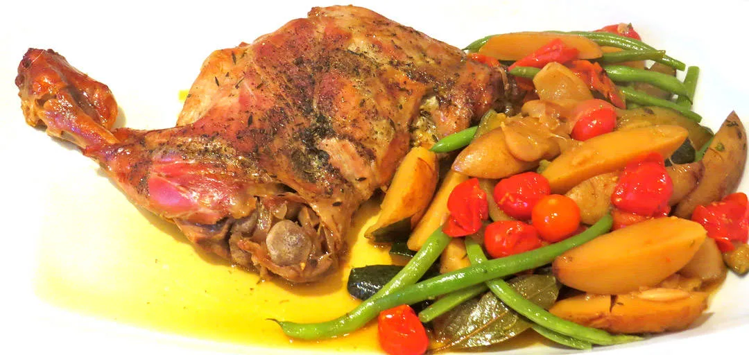 Ta forsiktig låret ut av gryten uten at alt kjøttet faller fra hverandre. Del opp på en fjøl og server sammen de deilige grønnsakene og skyen.