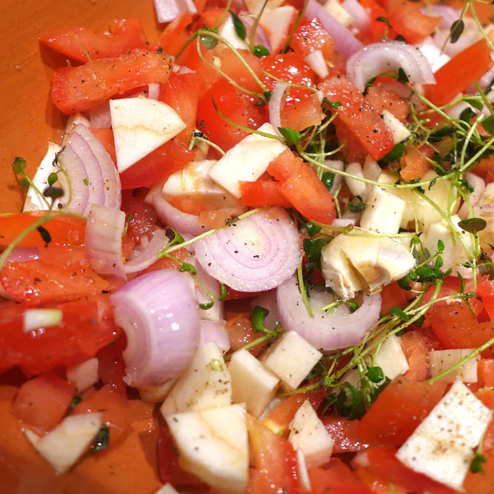 2 store grentomater som du deler i to og kaster frøene. Del tomatene i biter etterpå.