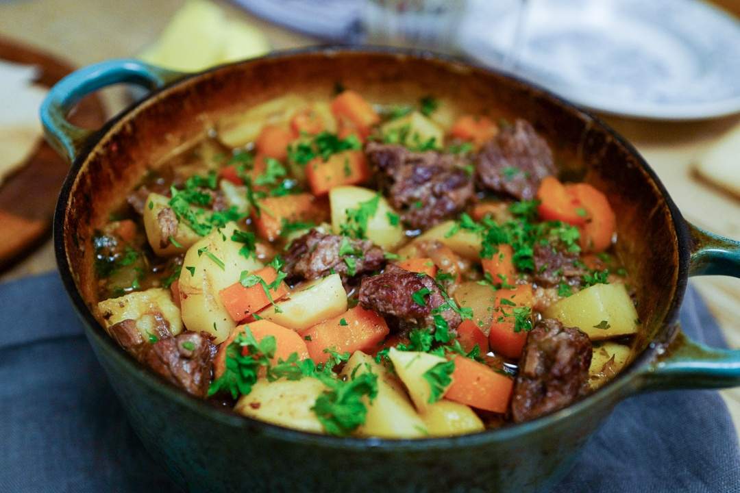 - Start med å skjære kjøttet i store terninger. Ha litt olje i en gryte og legg kjøttet i. La kjøttet brunes til alle sidene har en fin og gyllen hinne. Ta ut kjøttet og stek bacon, selleri og løk til løken er myk. Hell på vin og la alkoholen i vinen fordampe bort før du tilsetter kjøttet igjen, samt hvitløk, krydder og kjøttkraft. Sett på lokk og la gryta småputre i to timer.