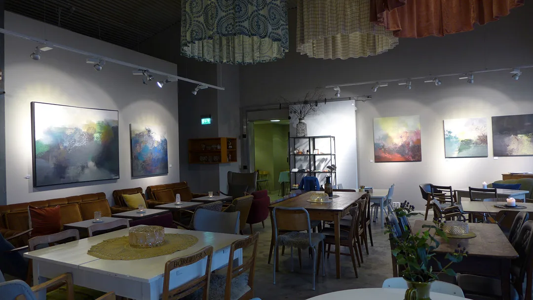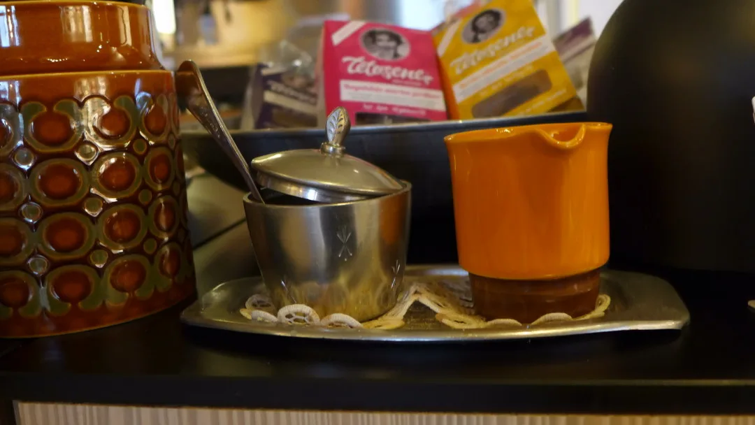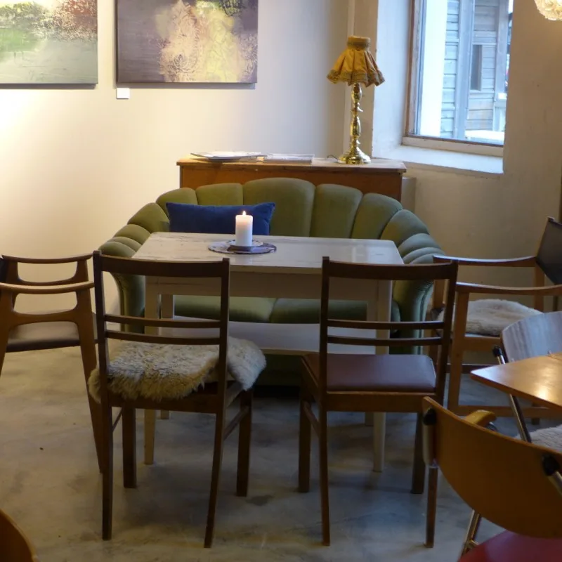 Det er en av de aller mest sjarmerende kaféene jeg har sett. Artig? Ja, på sett og vis er den finurlig. Bord og stoler er retromøbler sikkert kjøpt på loppemarked. Her finner du sofaer fra 70-tallshjem og stoler fra nedlagte skoler. Alt av servise er forskjellig og megalampene i taket er helt sikkert laget med stoffer fra gamle gardiner og lignende. Og interiøret er en stor del av det som er artig med stedet. Men kakene og baksten er et annet kapittel. På benken står de lekreste hjemmebakte kaker og kanelsnurrene står i ovnen. For en jævla amatør jeg er som nettopp kommer fra tidenes største hotellfrokost. Men jeg kunne jo ikke vite om denne perlen på forhånd…
