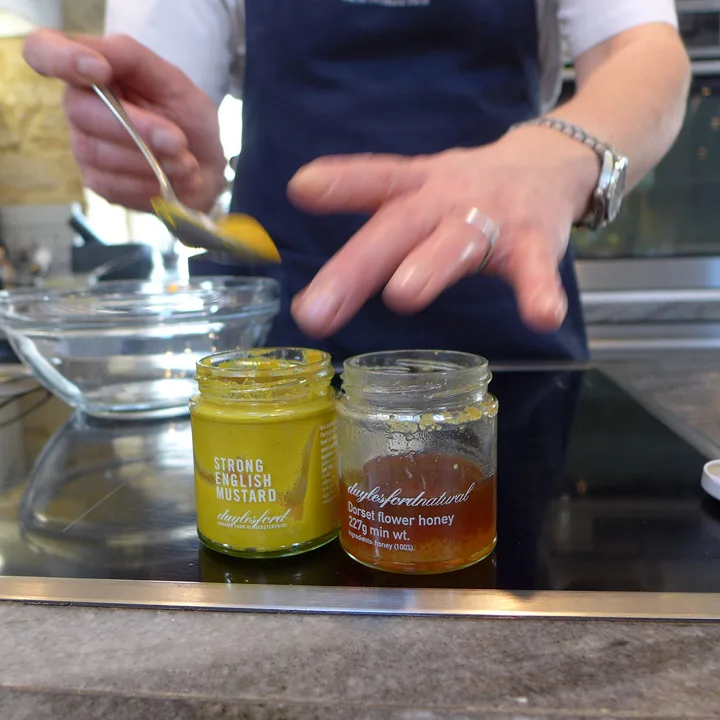 Legg dem over på et fat og del biter av god blåskimmelost og legg rundt på fatet. Osten smelter litt ned i de varme brokkoliniene. Så lager du en deilig dressing av engelsk sterk sennep, eddik, extra virgin olivenolje og honning. Ha dette over salaten i tynn stråle. Så drysser du noen mandelflak over og til slutt litt deilig extra virgin olivenolje. Snaddernam! Den grillede smaken på brokkolinien er bare helt fantastisk!