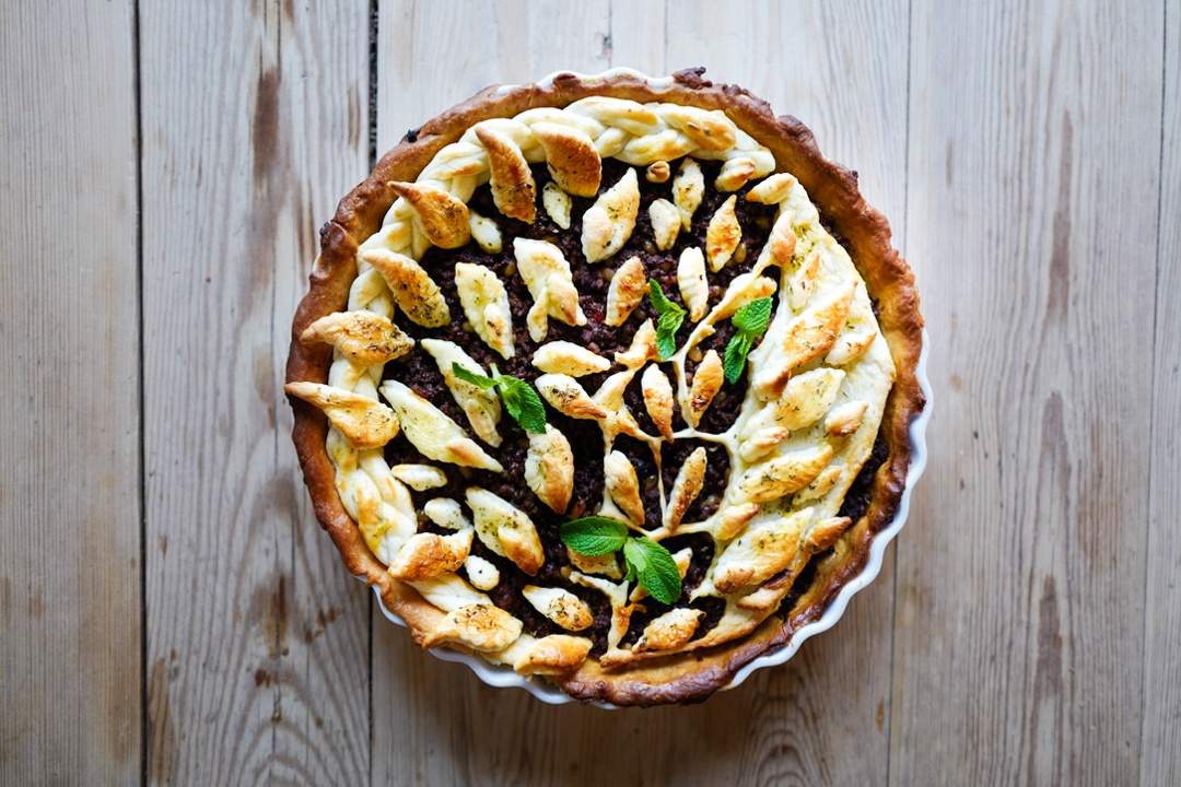 Fyllet til deigen er veldig enkelt. Det er løk, tomat, pinjekjerner, mynte og masse krydder. Paien stekes i to omganger: En gang uten fyll og så med fyllet. Dette gjør man for at paiskallet skal bli sprøtt og ikke soggy.