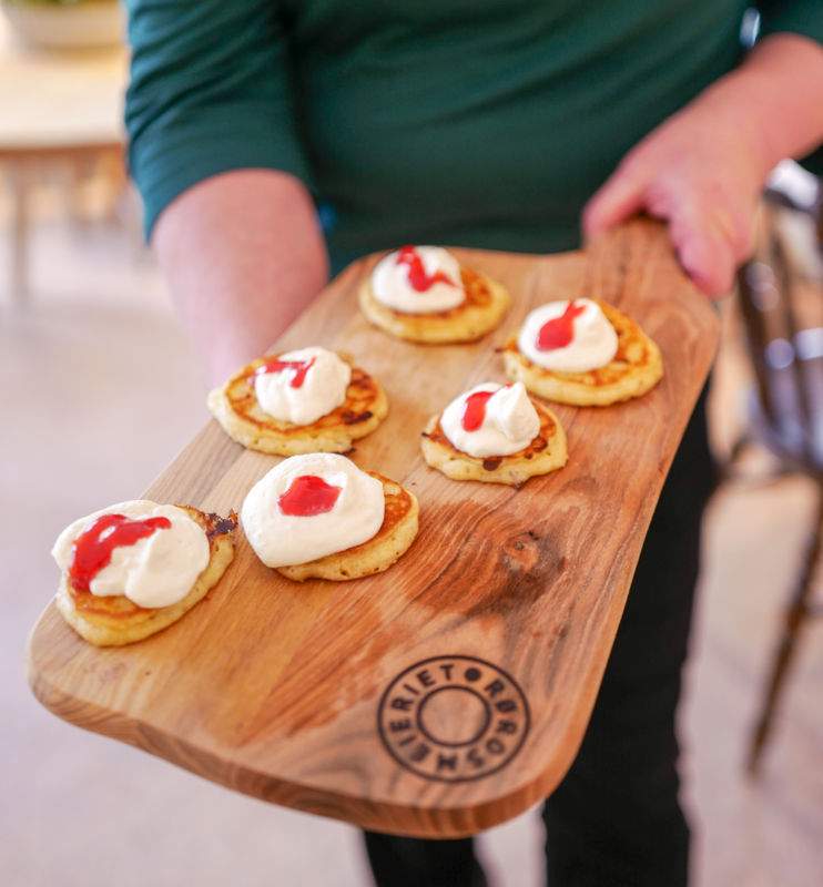 Lars-Eric serverer små, tykke pannekaker med smør skåret med ostehøvl. Det er så genialt og syndig. Og selvsagt selger de osthøvler som er perfekte til dette bruket i butikken. Danskene kaller det «Tannsmør» for du vil etterlate tannmerker når du biter igjennom smøret. Jeg synes vi kan adoptere det uttrykket, for det er akkurat det som skjer. Tennene setter merker.