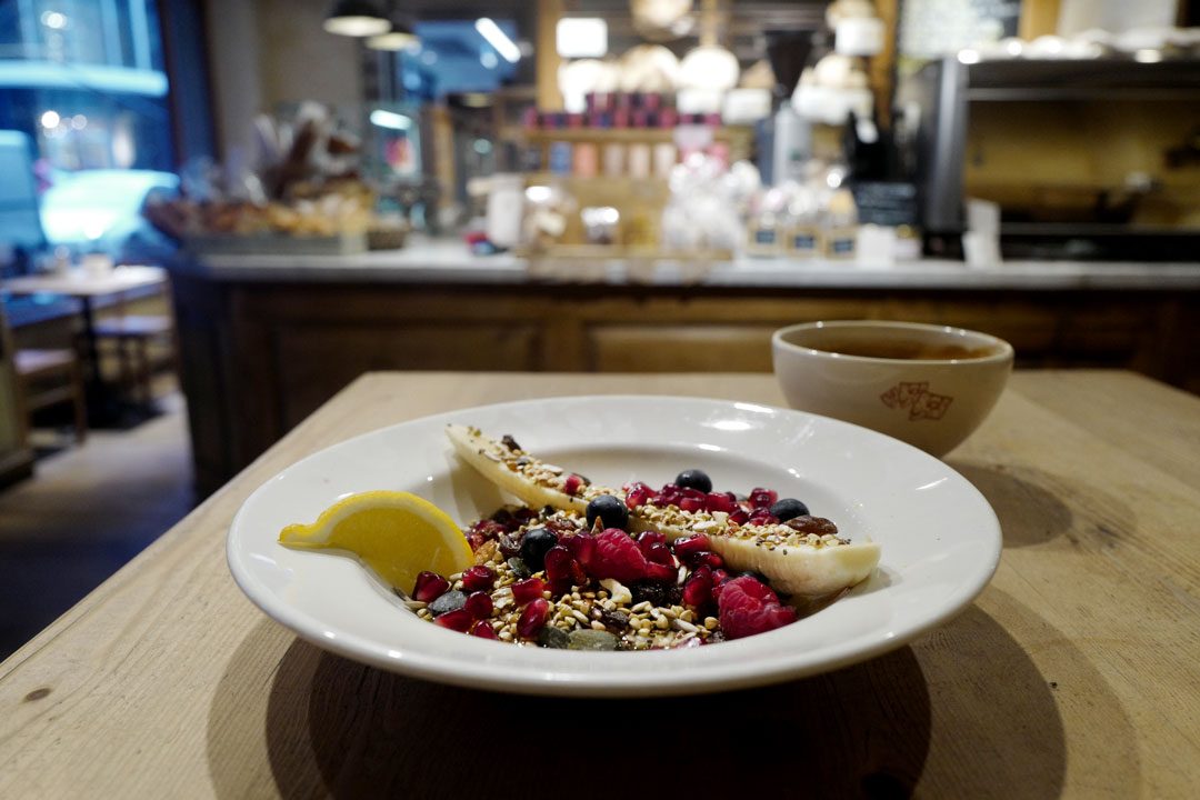Le Pain Quotidien er en internasjonal kjede av økologiske bakerier og spisesteder. Jeg har tidligere spist på en avdeling i Dubai med stort hell. Jeg spiser en herlig frokost i avdelingen som ligger ved Selfridges. Jeg velger til og med en vegansk frokost (!) Deilig kokosnøttyoghurt med bringebær, blåbær, granateple, gojibær, mandler, ristet frø, rosiner, banan og lønnesirup. Det geniale var sitronbåten jeg fikk til. En deilig skvis sitronsaft løftet hele retten. Deilig sterk kaffe til og jeg er happy.