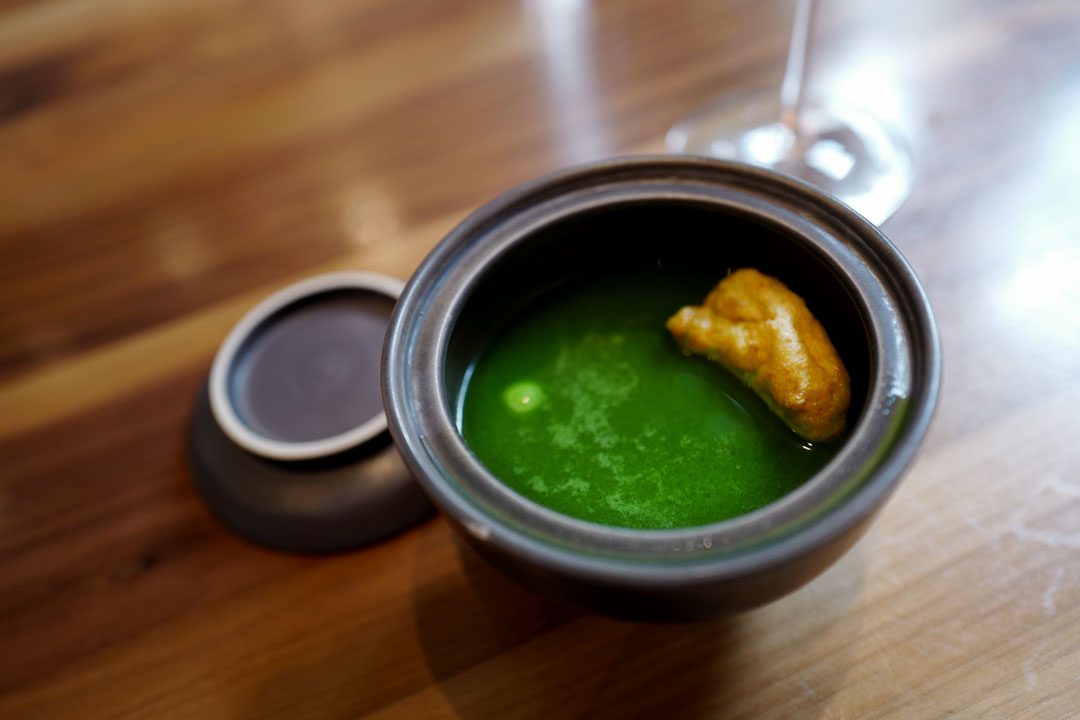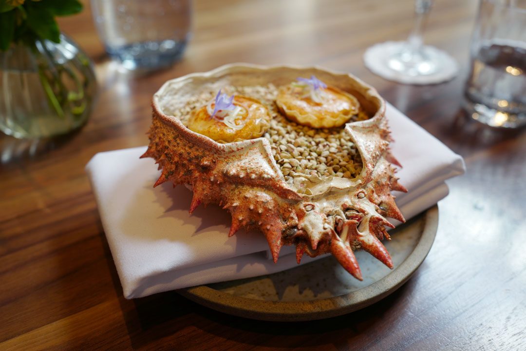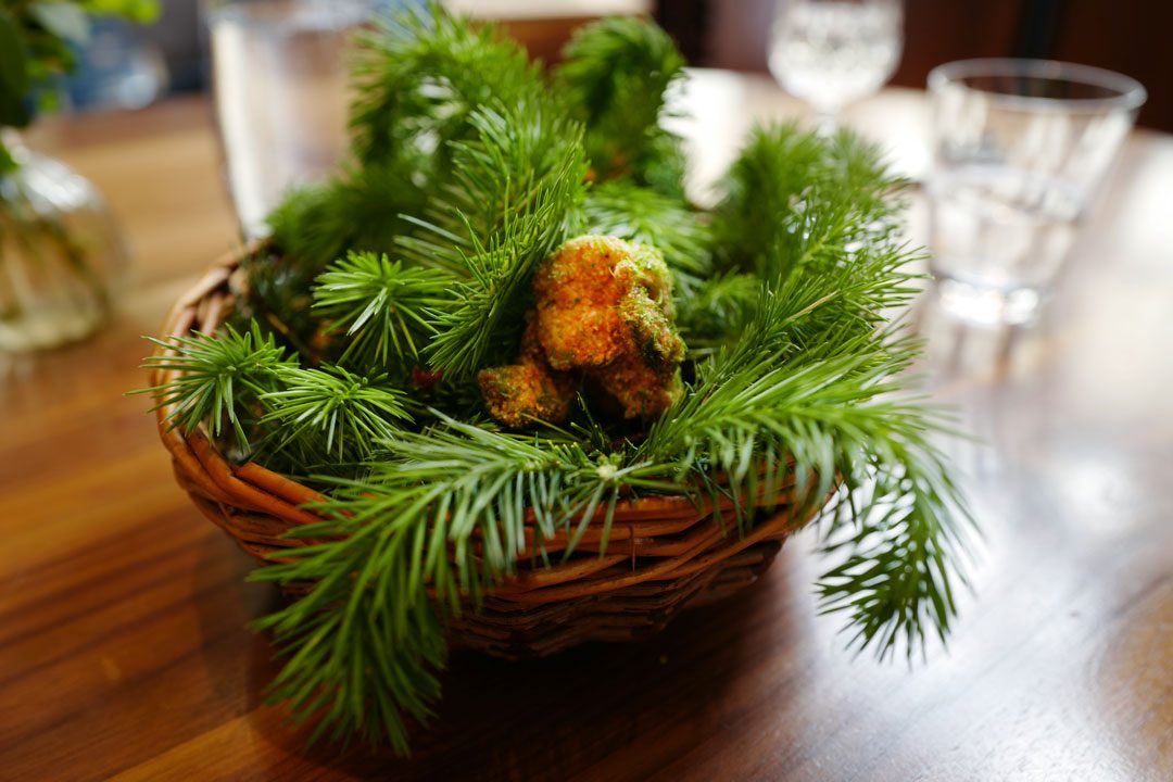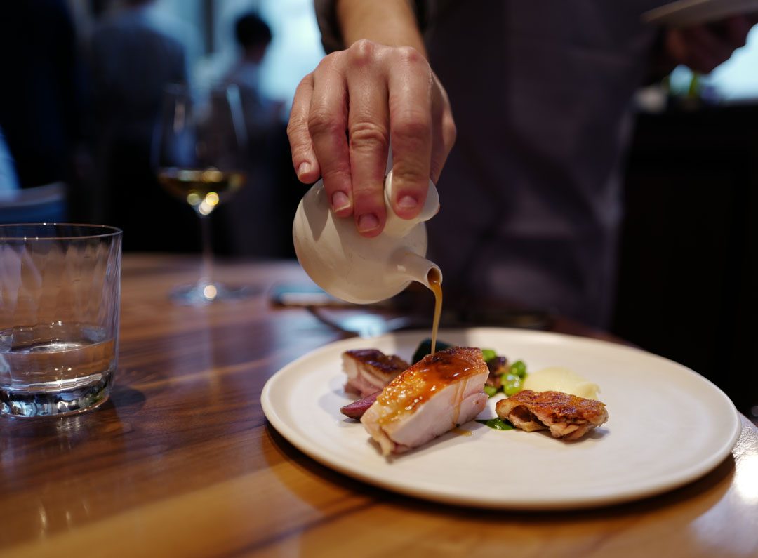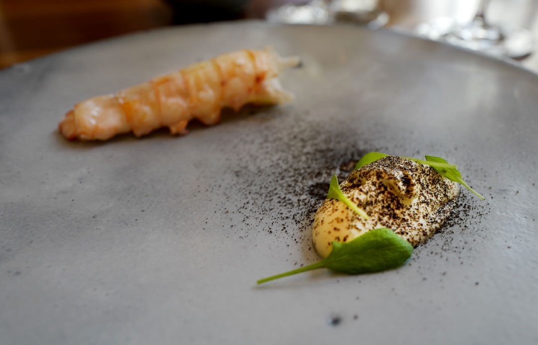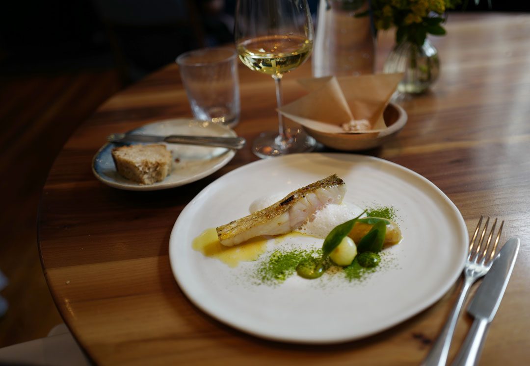 Frisk start: Frozen Zerbinati melon gazpacho & almond creamCornish Crab Tart & Brown Crab Hollandaise. For en krabbeelsker som meg kan du tenke deg hvor mye dette falt i smak.Krabbeterten. OMG! For noen fantastiske smaker.Haggis Bun & Cider Vinager Powder. Haggis har aldri smakt bedre.Buttermilk Fried Chicken & Pine Salt. Denne chicken-nugget’n smakte en god del bedre enn den de selger på KFC, altså….2016 Pinot Bianco, Berliner, Alto AdigeFlamed Cornish Mackrel sashimi, English Mustard, Cucumber & Chrysanthemum.2015 Pouilly Fuisse Les Crays, Eric Forrest, BurgundyScottish langoustine. Del en.Del to: Scottish langoustine i geléform.Spring Herb & Smoked Herring Broth. En smakseksplosjon av en suppe.2015 Wiener Gemischter Satz, Wieninger, ViennaKanelsalt til fisken, brød og smør..Hazelwood Grilled Pollack, Grelot Onion, Cinnamon & curry leaf. Med et dryss kanelsalt på toppen får du frem en fantastisk smak på fisken. Det tilhørende karriblad-skummet løfter det til en annet nivå. Stor matlykke!