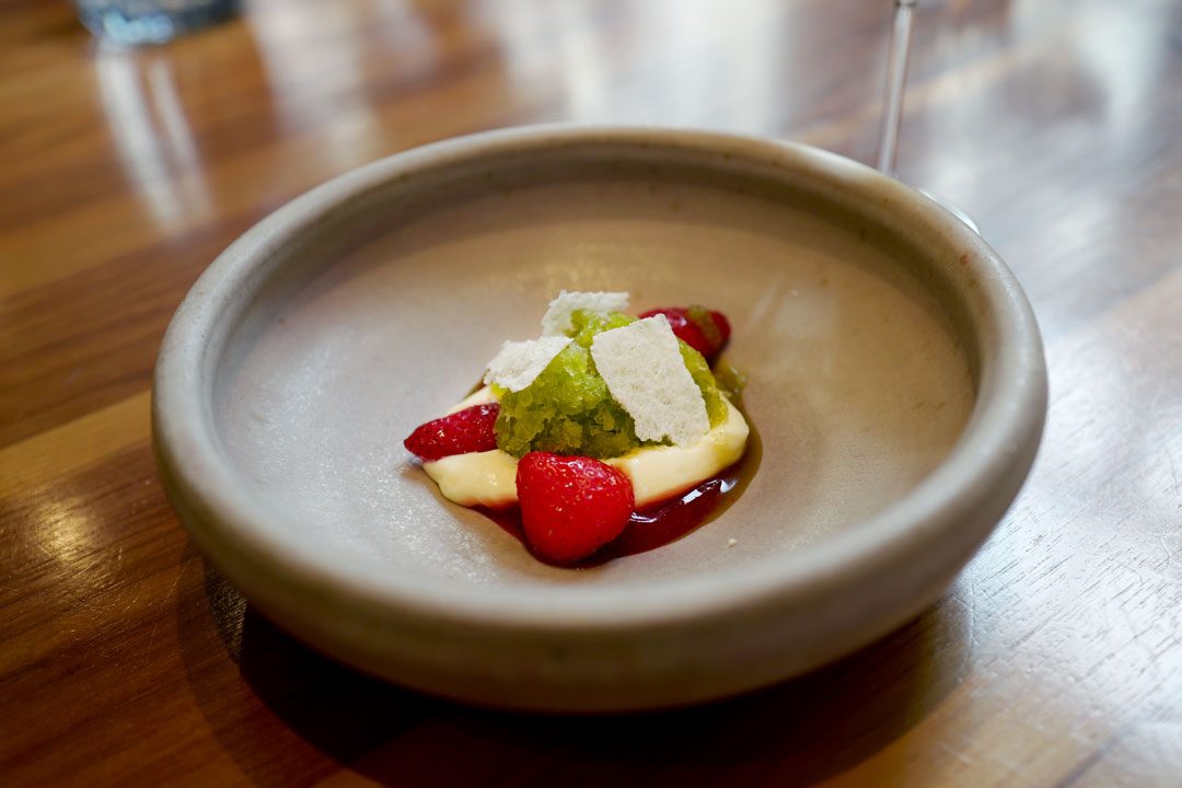 2015 Moscato D’Asti, Massolino, PiedmontWild Fennel Granita, Ewe’s Milk Mousse & Strawberries. Så frisk. Så deilig. Jordbærene er marinerte.