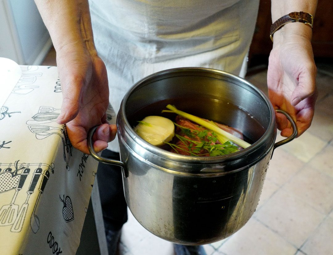 Vask og skrell grønnsakene. Lag et lite snitt i kjøttet sett inn hviltøksfeddet. Legg alle ingrediensene inne i en stor gryte fylt med vann. Kok opp.