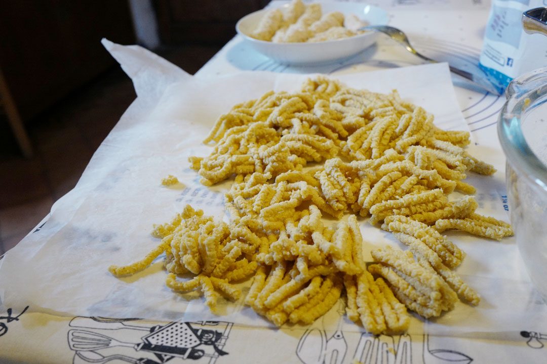 Det lukter deilig kraft i kjøkkenet når jeg kommer inn. Hun er i gang med å forberede den ene retten hun skal servere. Det er passatelli hun skal lage. Jeg har aldri spist en liknende rett: Det er en slags tykk pasta laget av brødkrummer, Parmigiano Reggiano og egg i deilig kraft. Og kraften! For en fantastisk smak den har!