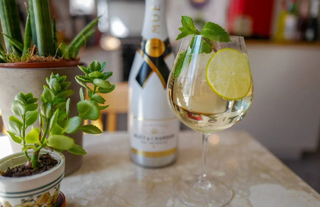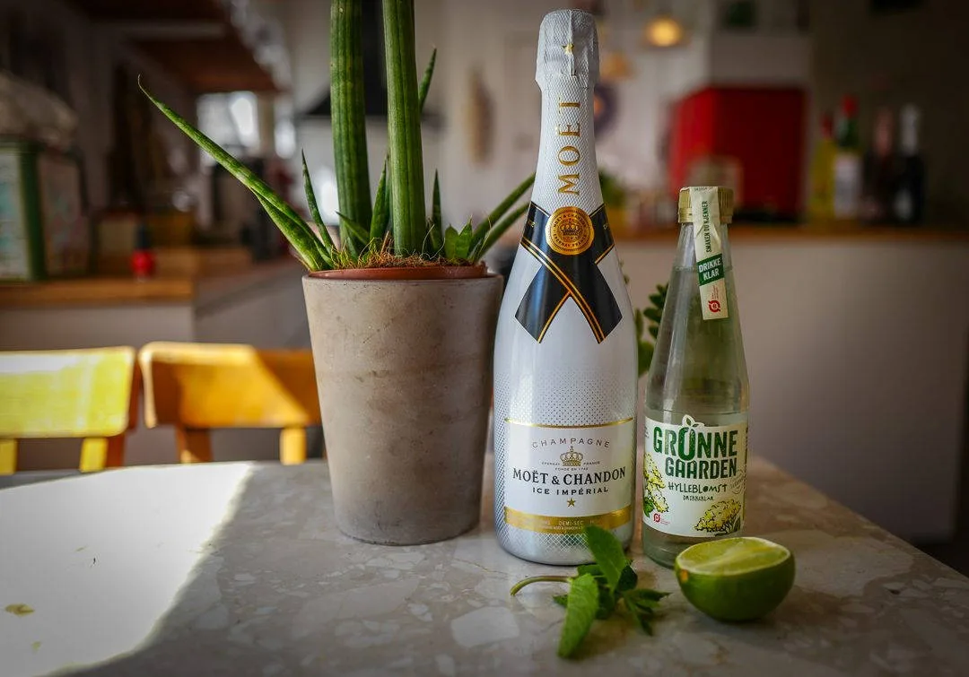 Legg mynte og limeskiver i glasset og knus forsiktig med en skje. Legg masse is i glasset og fyll på med hylleblomstsirup eller -saft og kullsyreholdig vann. Topp med champagne og nyt!