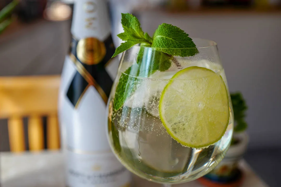 Legg mynte og limeskiver i glasset og knus forsiktig med en skje. Legg masse is i glasset og fyll på med hylleblomstsirup eller -saft og kullsyreholdig vann. Topp med champagne og nyt!