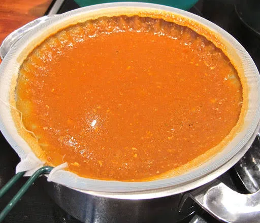 Sil av alle skall og grønnsaker i en vanlig sil først. Etterpå: Sørg for å sile kraften i en finmasket sil eller et linklede for å få bort alle urenheter.