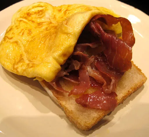 I en bolle pisker du et stort egg med 4 ss melk. Ha en liten smørklatt i pannen og helle eggeblandingen i. La det bli en slaggs pannekake. Vær rask, for egget skal ikke stivne helt på toppen. Fold sammen og legg det på toppen av spekeskinken. Det du har nå er en herlig, florlett miniomlett, varm og lettere sprø spekeskinke, samt ristet og deilig brød. Dra et drag med sortpepper over, men vær forsiktig med saltet, for spekeskinken inneholder det du trenger for å salte retten.