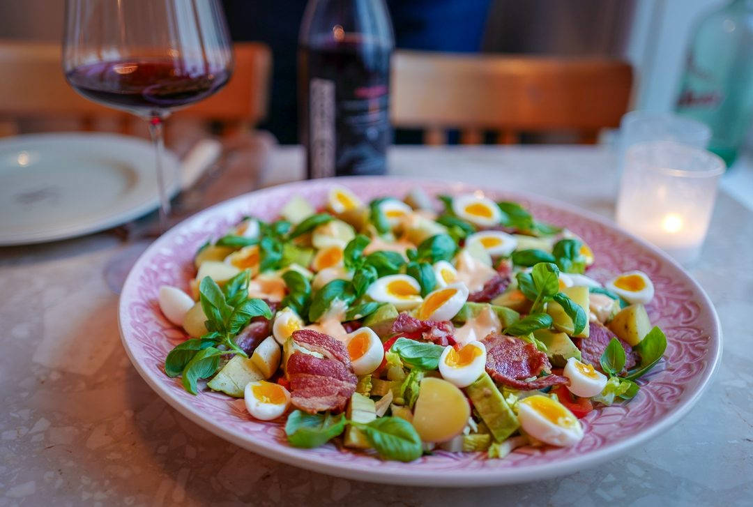 Det er sinnssykt deilig å slippe å lage mat av og til. Forrige uke var det en slik dag da jeg ga beskjed til mannen min, Erik, om at nå hadde det vært koselig om han lagde middag. Og denne oppgaven tar han seriøst. Resultatet ble en fantastisk fargerik og nydelig lun vårsalat der vi fikk brukt opp en del «loose ends» fra kjøleskapet; en bit agurk her, en halv paprika der, noen vaktelegg, baconrester osv. Du skjønner greia.