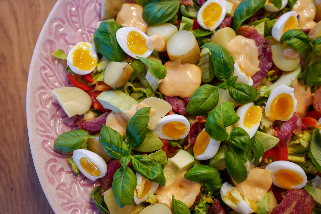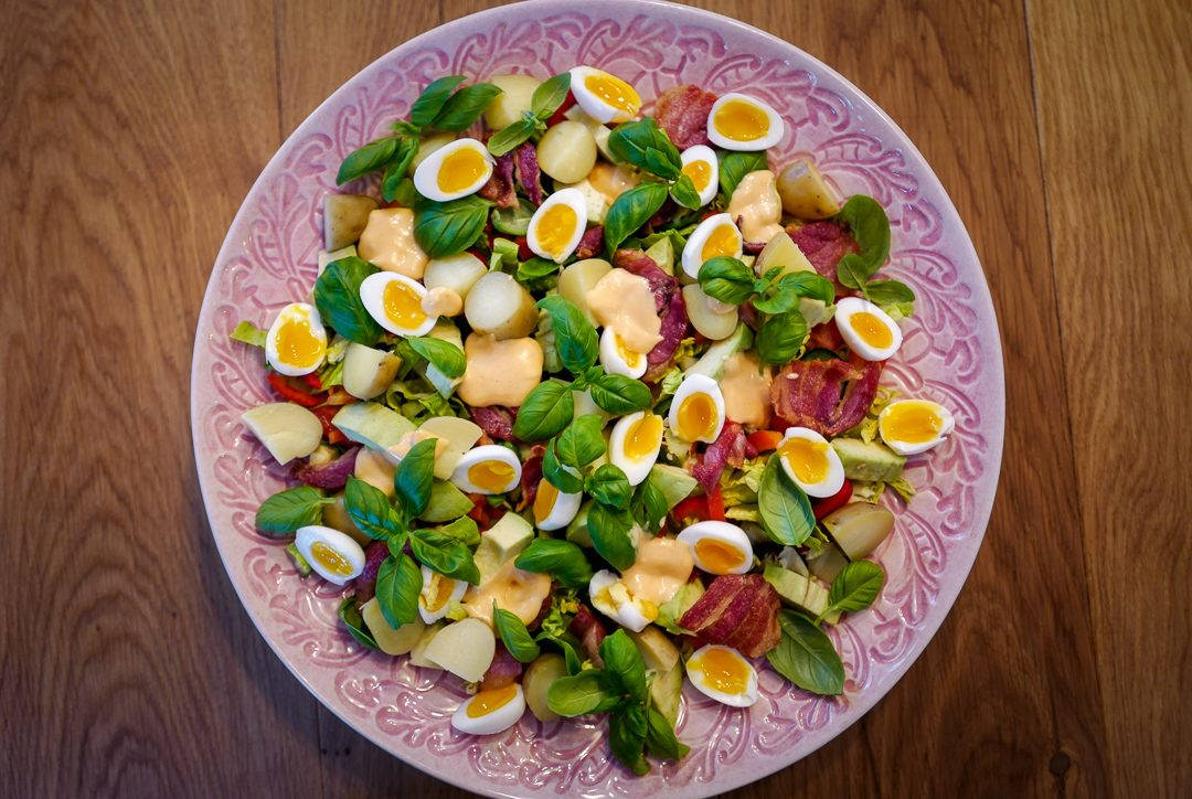 For vi hadde jammen meg mye godt i kjøleskapet og salaten ble knallgod og den var sikkelig mettende. Det hjelper med deilige poteter og litt bacon, da.