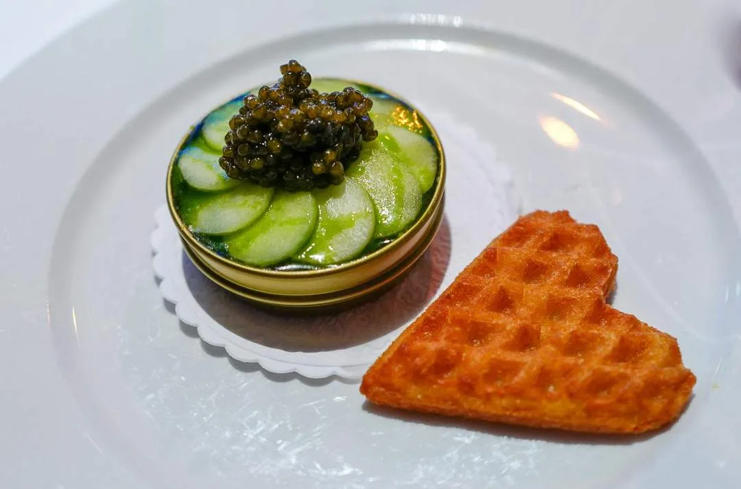 Den lille kaviarboksen var fylt med kremet hyse fra Garten, agurk og kaviar. Til denne lagde Christopher en tjukkmjølksvaffel. Så dekadent. For en start!