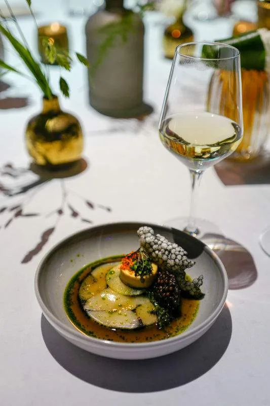 Lasse Waagbø fra Clarion Hotel Trondheim har trukket seg ut av kokkeyrket men gjorde comeback under festmiddagen og serverte kveite med brunt smør, jordskokk, eple og et las med høvlet trøffel på toppen.