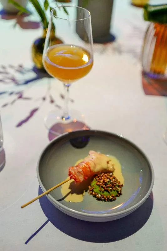 Det ene høydepunktet etter det andre. Fredrik Engen er kjøkkensjef på Spontan vinbar. Han serverte sin allerede legendariske rett: Sjøkreps fra Horsgaard med estragonemulsjon. Til denne retten fikk vi Lamo Wit fra EC Dahls bryggeri.