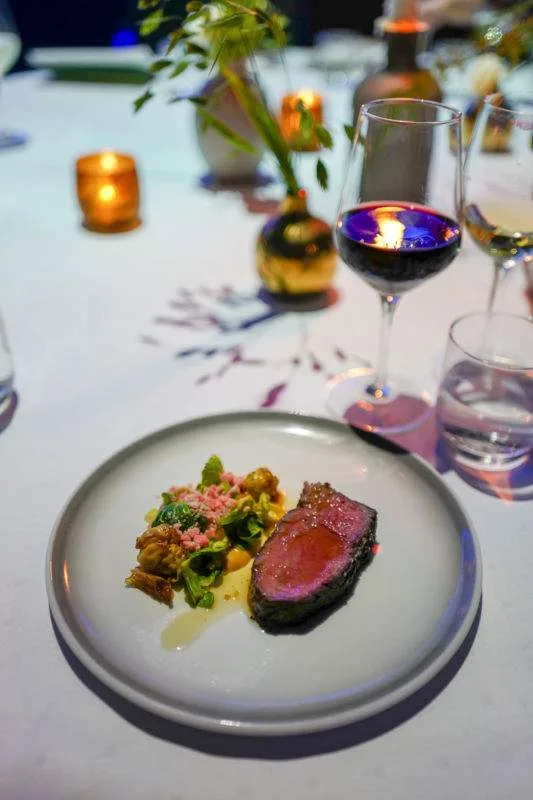 Eskil Hildonen fra To Rom og Kjøkken serverte siste rett før desserten. Et deilig stykke ytrefilet av okse fra Gauldal med fermentert rosenkål, yuzu og margbein.