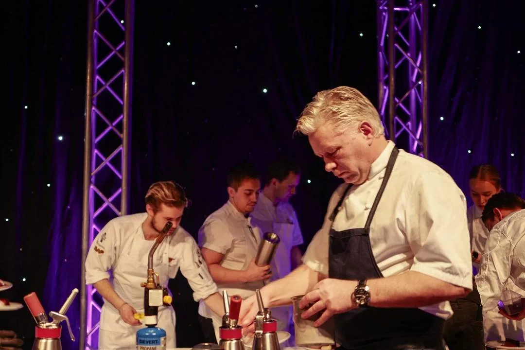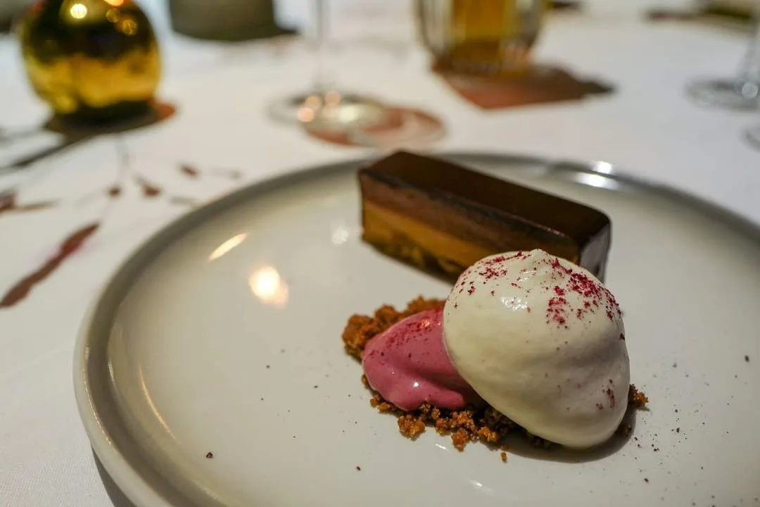 Hvem ellers enn legendariske Lars Lian kunne stå for desserten. Mannen som har skjemt bort trøndere i flere tiår serverte kveldens dessert med god hjelp fra de andre kokkene som med stor respekt utførte oppgaver etter ordre fra legenden. Hans sjokoladedessert med praline, solbær og yoghur og tonkabønner var en perfekt avslutning på en magisk kveld.