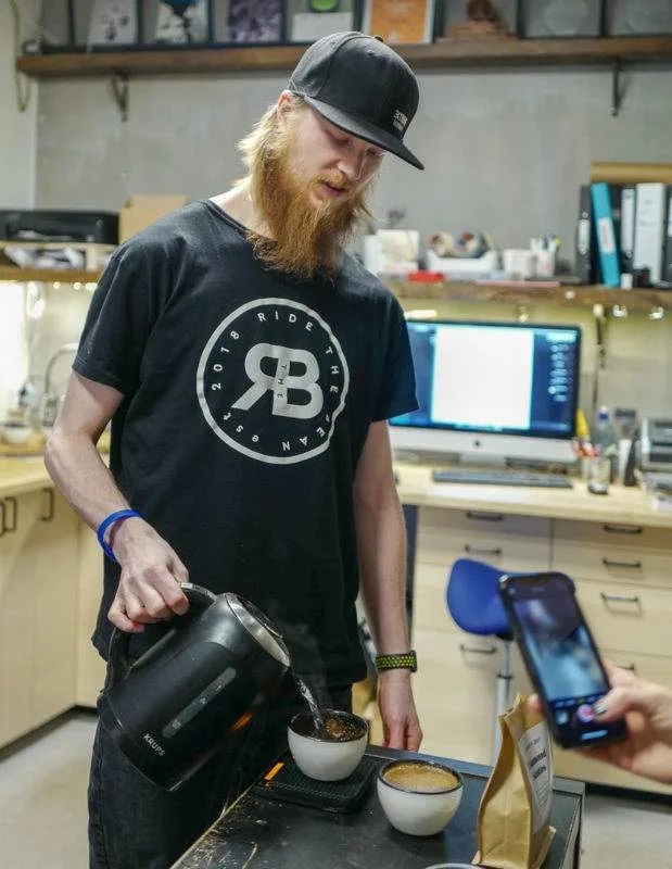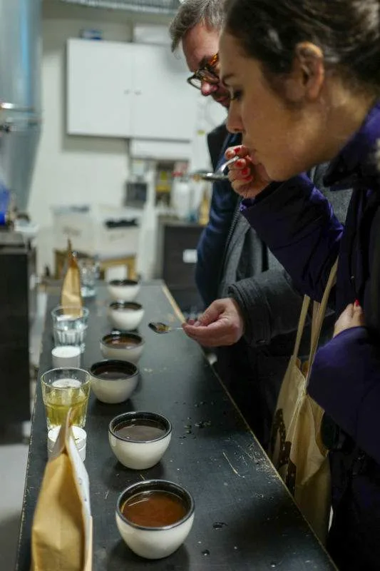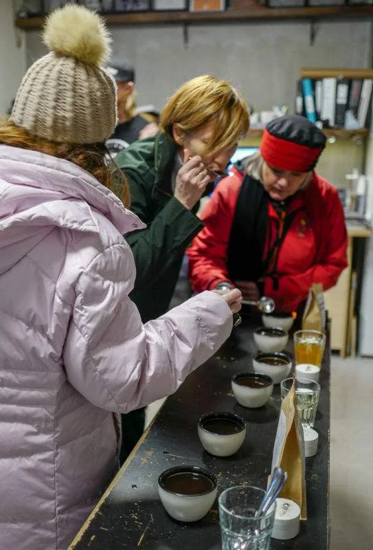 Første stopp var cupping på Jacobsen og Svart, stedet for god kaffe i Trondheim. Vi fikk en gjennomgang i hvordan vi smaker kaffe på profesjonelt vis. Det er åpenbart at internasjonal presse samt jorunalist-blogger fra Oslo har litt annen smak enn trønderne. For vi syntes alle andre kaffetyper enn storselgeren Worka var å foretrekke. En skikkelig artig opplevelse.