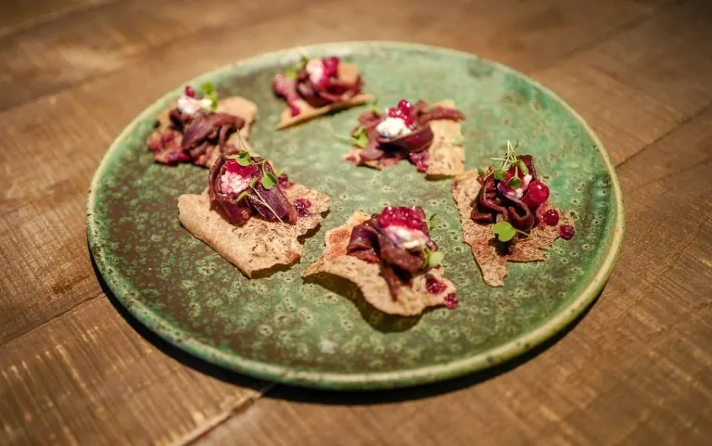Før selve middagen fikk vi servert Roar Hildonens øl som han har laget i samarbeid med EC Dahls Bryggeri. Kyoto er navnet på Hildonens verdenskjente cocktail. Nå er det laget et øl som har de samme eksotiske tonene. Til dette fikk vi servert speket reisnsdyrkjøtt med Rørosrømme, pepperot og urter fra Stensaas på Røros samt Tronfjellskinke fra Tynset.