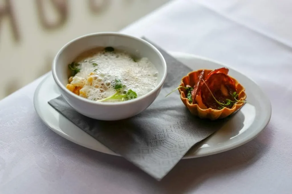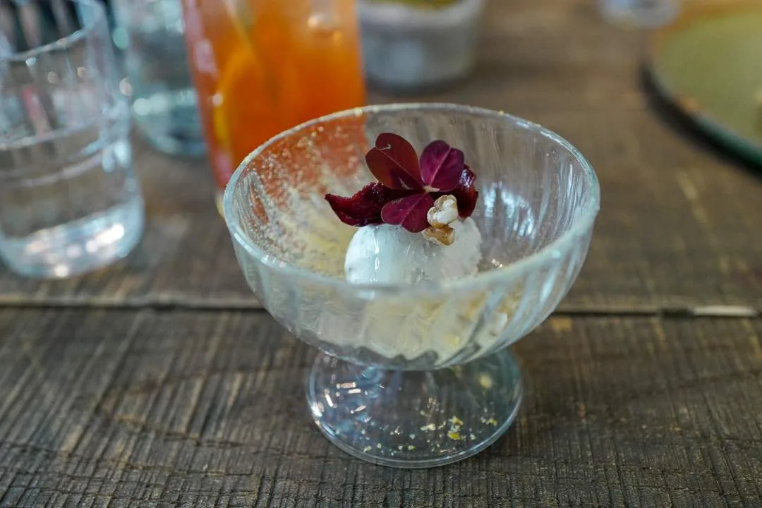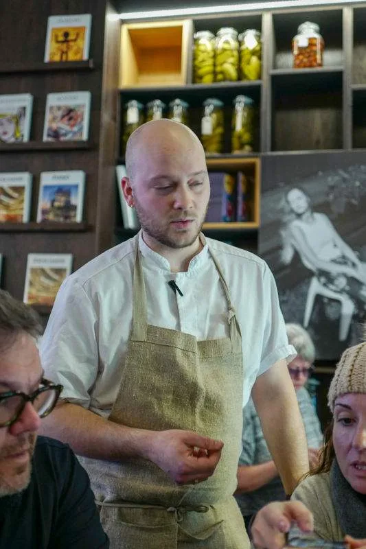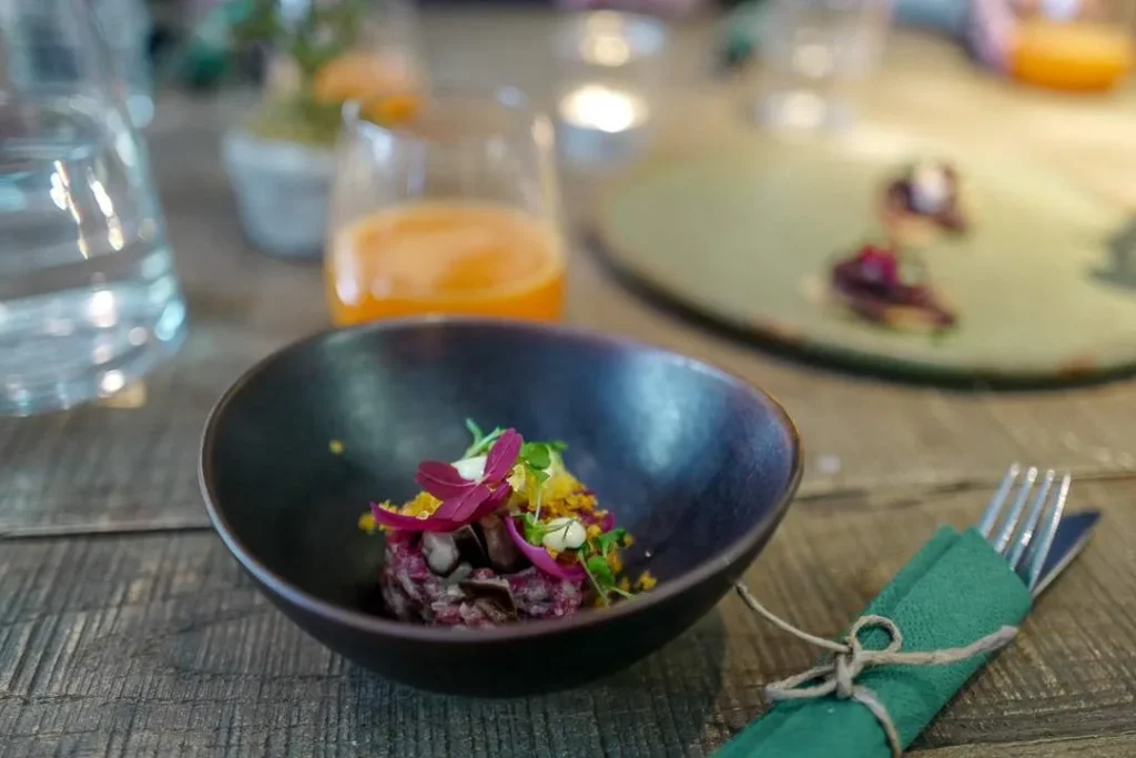 Guiden vår tar oss med til Restaurant Atelier de vi får prøve reisdyrtartar, lokal shitakesopp, pølser laget av shitakespisende griser og ikke minst den eventyrlige blåmuggostiskrem laget av prisvinnende Simens Isbar.
