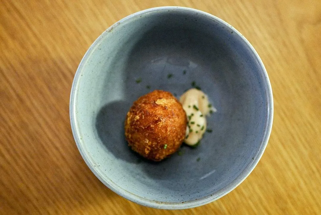 Videre får vi fantastiske potet- og klippfiskboller av mandelpotet fra Kvikne med trollkrabbemajones og trollkrabberogn. For en smaksbombe!