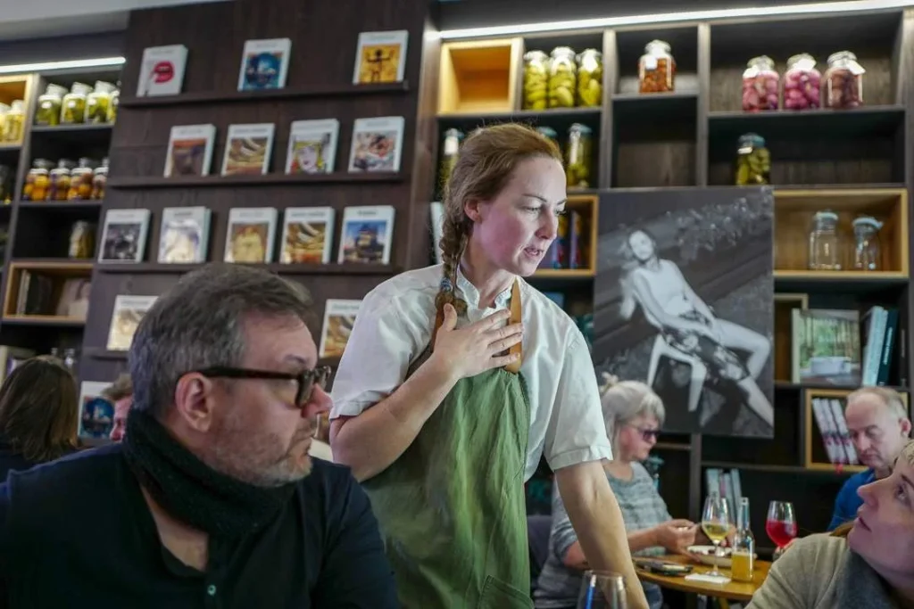 Sellanraa Bok og Bar er neste stopp og der støter vi på Kristin Helene Randulff Nielsen, kjent sanker og damen bak boken Selvplukk. Hun jobbet på Sellaraa denne dagen og det var jo ekstra spennende for oss som skulle prøve flere av Sellaraas deilige retter smaksatt av flere av Kristins plukkede urter og vekster.