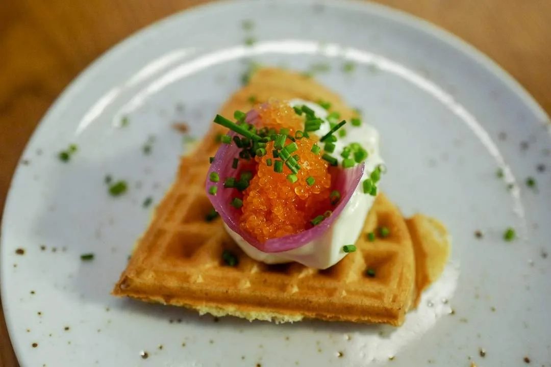 Vaffel med rømme fra Fannrem, sikrogn fra Røros med syltet løk og dill.