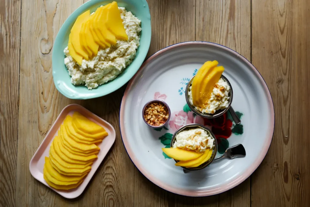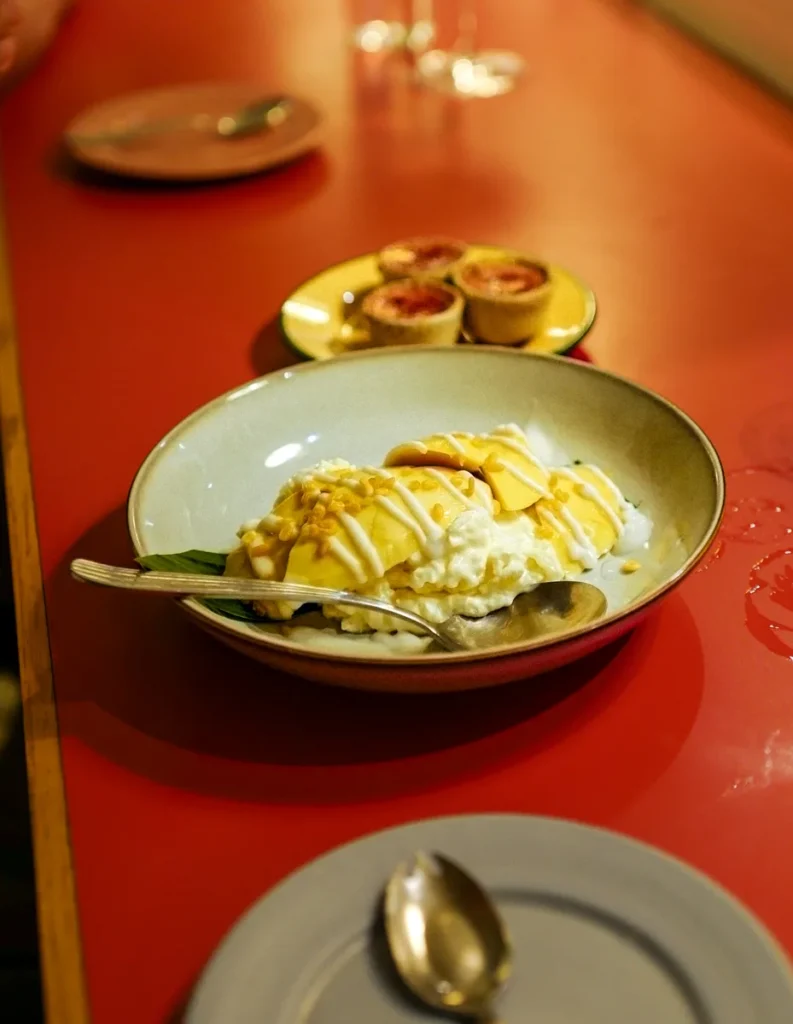 Siste kveld i Bangkok fikk jeg en dessert som jeg ble veldig glad av å spise. Det var fordi den minnet meg om riskrem når riskrem er godt. Det var en variant av den thailandske klassikeren Mango Sticky Rice, men som en dansk risalamande. Det var på trendy Charmkrung jeg fikk denne desserten servert.