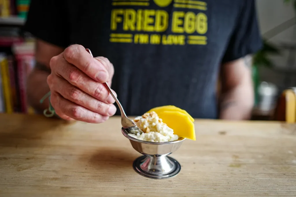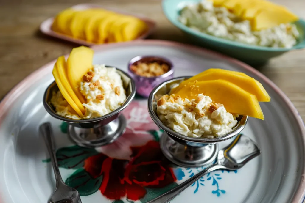 Det som er viktig er å vende den kalde risgrøten inn i kremen litt av gangen. Sørg for at riskremen er luftig, så ikke pakk mer risgrøt inn i kremen enn nødvendig. For å få den ultimate Mango Sticky Rice-følelsen kan du helle litt kokoskrem av god kvalitet over den ferdige retten ved servering.