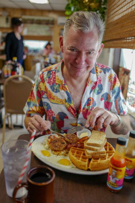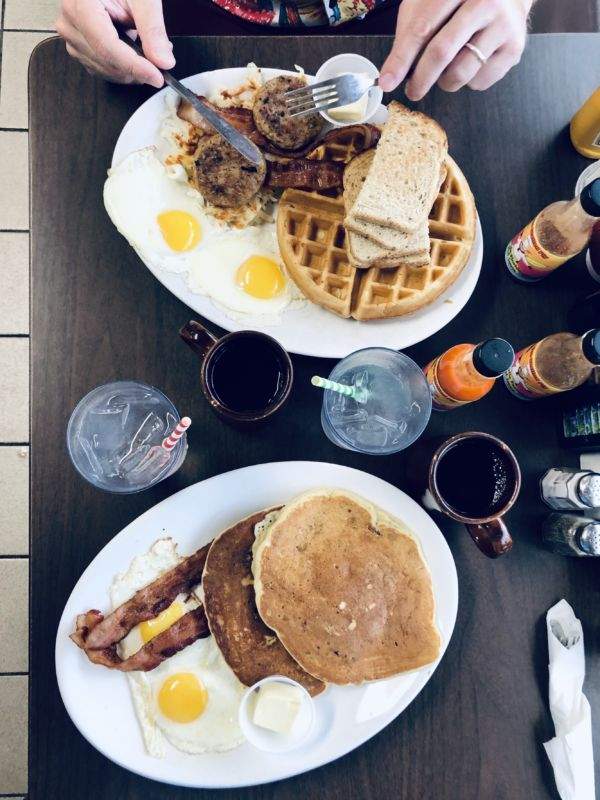 Vi må klarer oss selv og valget faller på pekanpannekaker med to stekte egg og bacon for min del, mens Erik bestiller «The Pig Wafler» med hele pakka. Den består av vafler, stekte, revete poteter, pølsepatties, bacon og toast. Snakk om frokost. Og vi nyter. Vi spiser oss flaue og skyller ned med mer kaffe som til enhver tid blir helt i koppen.